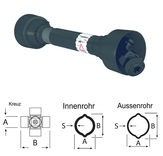 Der Lieferumfang beinhaltet eine komplette Gelenkwelle Baugröße AGM860 mit Anschlussgabeln (Profil 1 3/8" (6)), Schutz, Haltekette/n, Bedien- und Montageanleitung inkl. Konformitätserklärung.