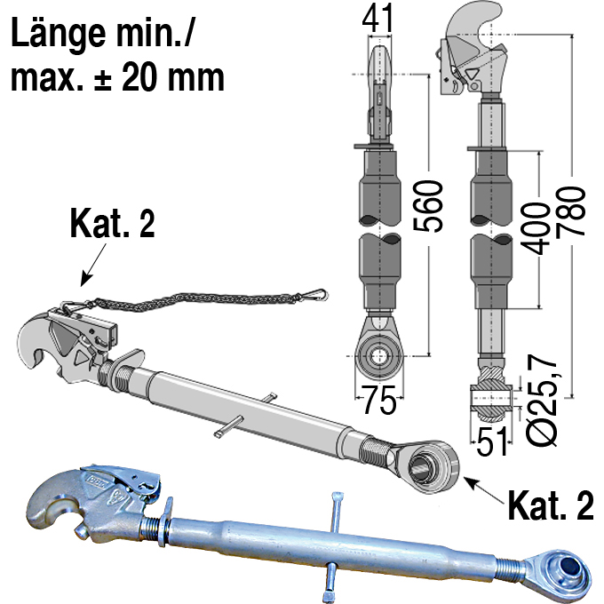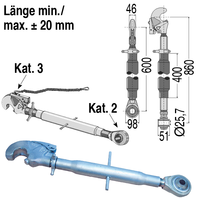 Oberlenker hydraulisch, 600 – 830 mm, Kat. 2