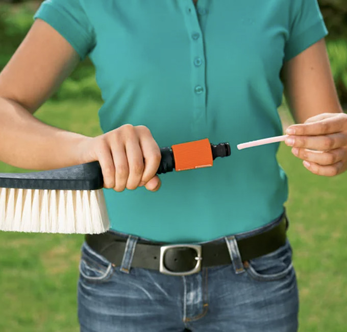 Die GARDENA Seifenstäbchen (Art. 989) sorgen für eine noch gründlichere Reinigung. Einfach den Reinigungsstick in die Bürste stecken, Bürste auf den Schlauch klicken und schon wird das Shampoo optimal dosiert automatisch dem Wasser beigemischt. Das erspart ein umständliches Anmischen von Putzwasser mit speziellen Reinigungsmitteln und das Wasser-/Seifengemisch wird direkt über die Bürste auf die Oberfläche aufgebracht. Die optimale Kombination, um Schubkarren und ähnliche Flächen sauber zu schrubben.